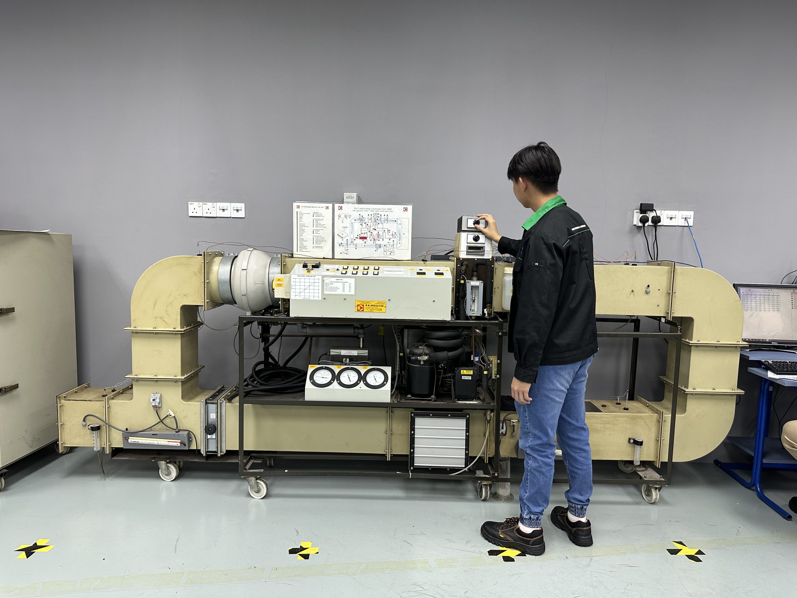 Instrumented air conditioning laboratory unit to demonstrate of the processes and components used in heating, cooling, humidification, de-humidification of an airstream.